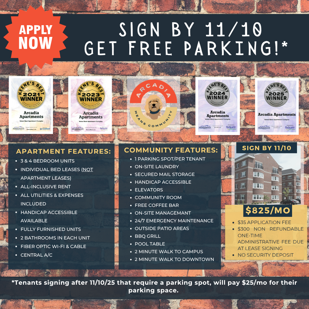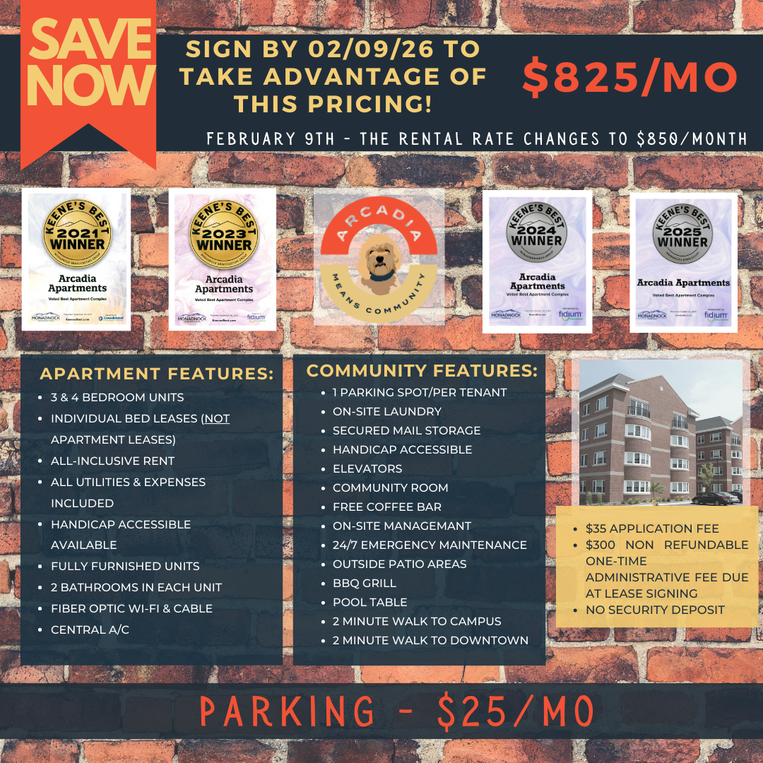 I believe Arcadia is the best option when it comes to off campus housing for students. The price of rent is the most affordable option I've seen throughout all of Keene. The apartments are clean, and the fact that they come fully furnished is definitely a major bonus. I would recommend to anyone interested!